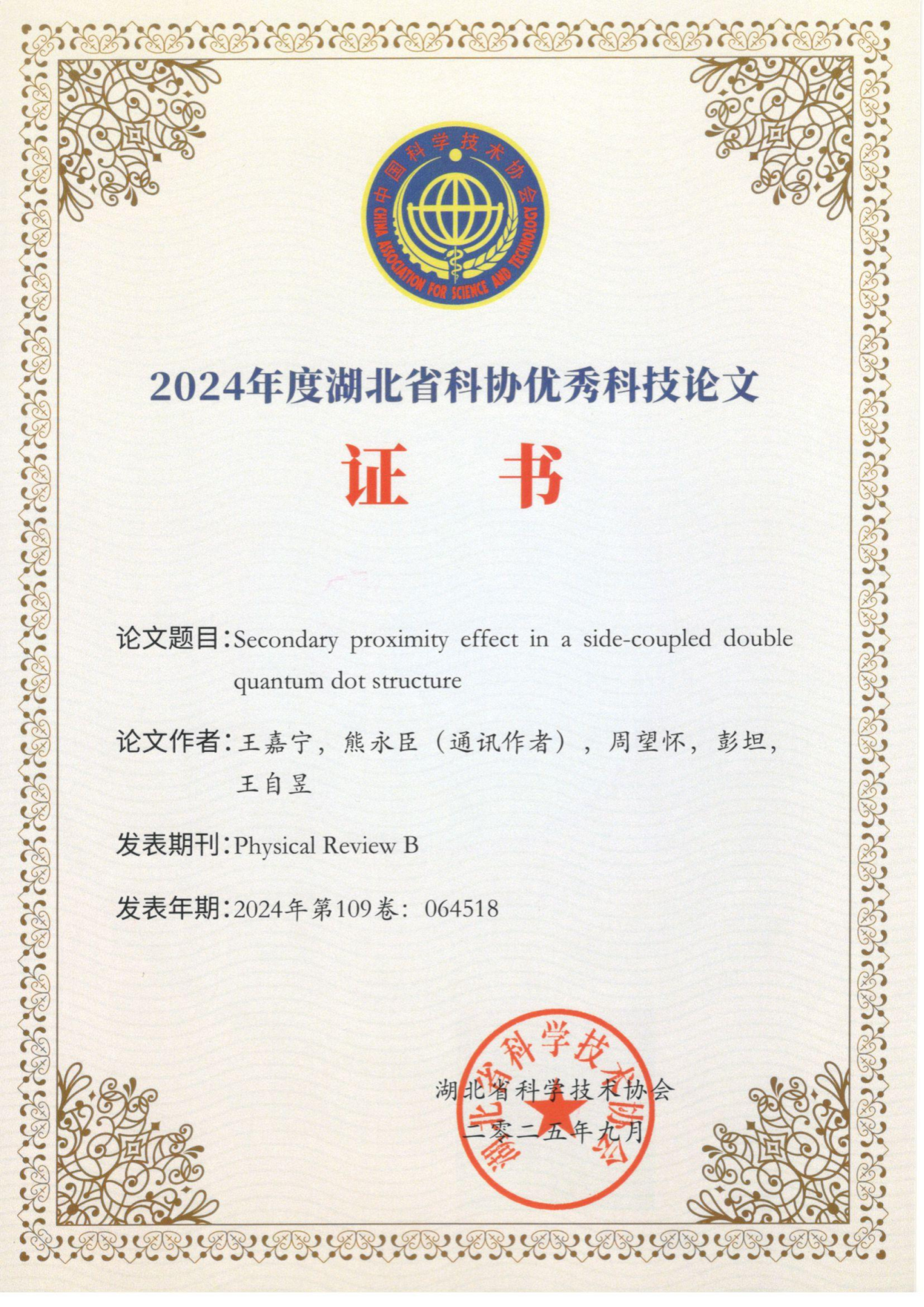 近日,湖北省科学技术协会公布了“2024年度湖北省科协百篇优秀科技论文”名单,光电工程学院、新能源学院、汽车未来技术学院微纳结构与量子器件团队2024年2月发表于凝聚态物理顶级期刊Physical Review B的论文“Secondary proximity effect in a side-coupled double quantum dot structure”成功入选。论文第一作者为我们光学工程专业2021级硕士研究生王嘉宁(现为安徽大学在读博士研究生),通讯作者为团队负责人熊永臣教授及相关校外合作者。研究成员还包括团队周望怀副教授和彭坦博士,我校为第一通讯单位。