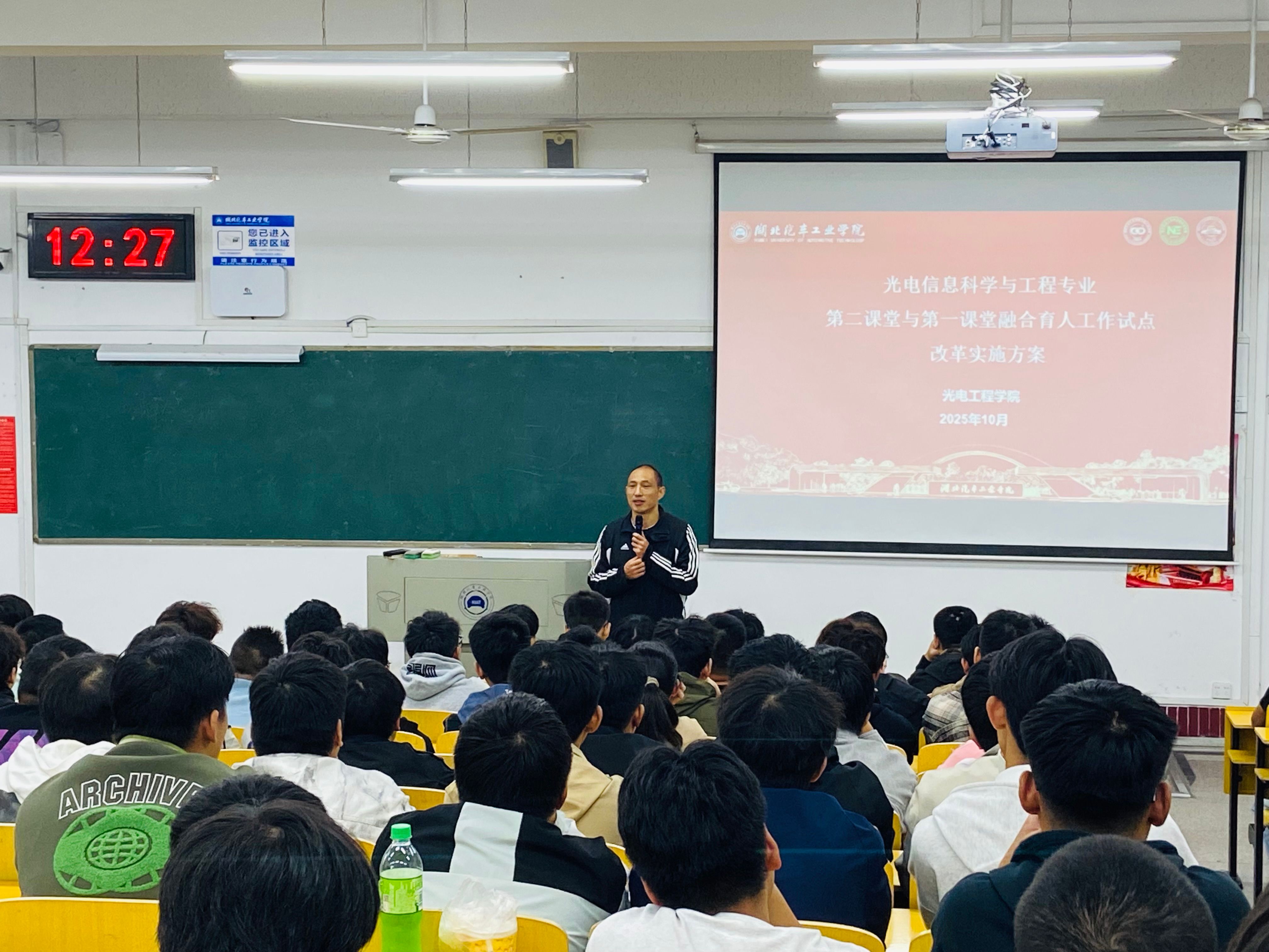 为全面推进素质教育,深化人才培养模式改革,光电工程学院于10月14日中午在2101教室面向光电信息科学与工程专业2024级、2025级全体学生,举办了“第二课堂与第一课堂融合育人”试点改革实施方案专题宣讲会。此次宣讲旨在向同学们详细解读学院新推行的“第二课堂成绩单”制度及学分替代政策,引导学生主动规划学业与发展,提升综合竞争力。