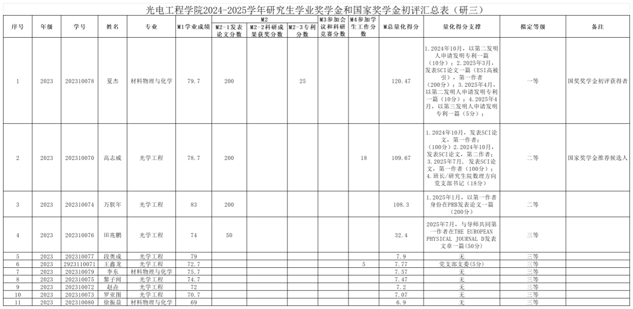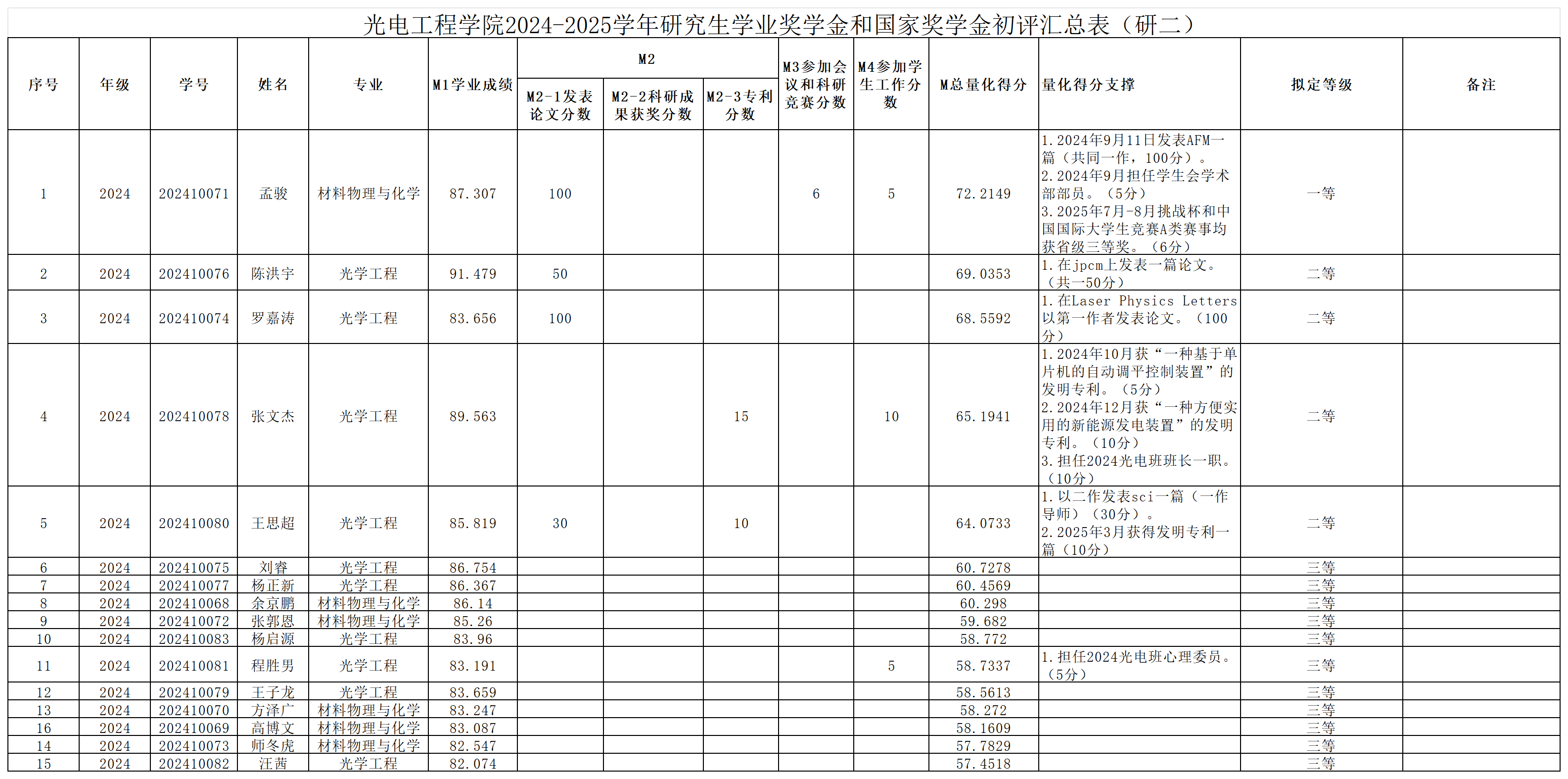 根据《湖北省学生资助资金管理办法》(鄂教财〔2023〕58号)以及湖北省学生资助管理中心相关工作要求,按照《必威betway中文官网研究生奖助学金管理暂行办法》(汽院发〔2025〕24号)有关规定,结合《光电工程学院、新能源学院2024—2025学年研究生奖学金评定量化计算办法》。经研究生个人申请,学院审核评选,现将2024-2025学年研究生学业奖学金学院初评结果进行全院公示,公示期为5个工作日,2025年10月14日至10月18日,在此期间若有异议,请于2025年10月18日前将意见反映至1108办公室张朋刚老师或1116办公室张传坤老师处。