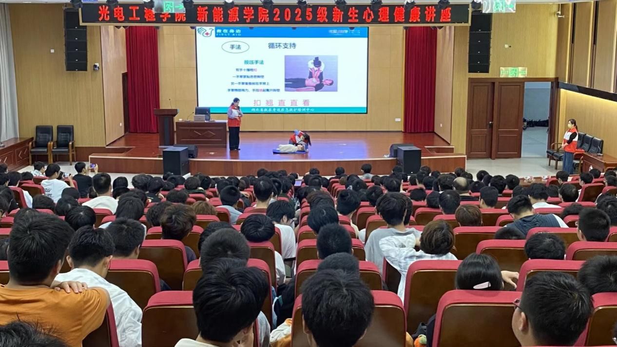 为帮助新生提升安全防护意识与应急处置能力,守护学生身心健康,9月29日晚,光电工程学院、新能源学院组织开展新生入学急救专项培训与心理健康讲座,十堰市中医医院心理咨询中心主任陈红、十堰市太和医院医务社工孙海燕、学院团委书记秦运来、新生辅导员王淑君及全体2025级新生参加此项活动,活动由秦运来主持。