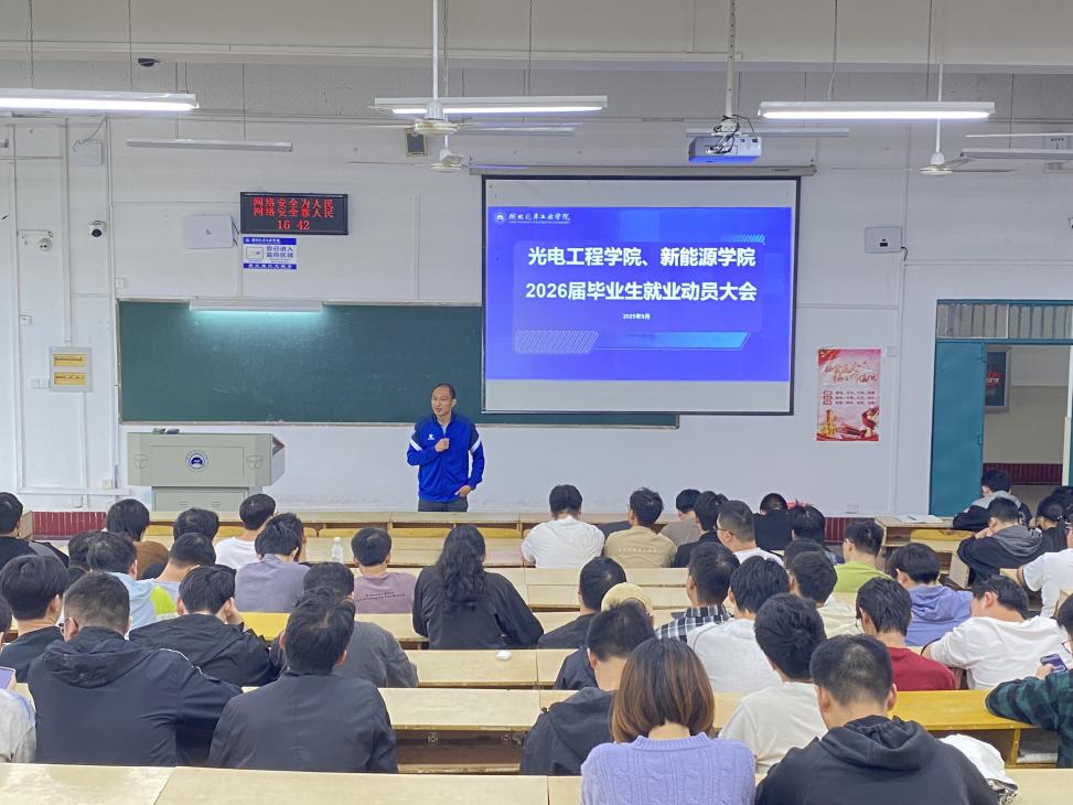 为帮助2026届毕业生明晰就业方向、树立正确的就业观,筑牢就业安全防线,9 月 19 日下午,光电工程学院、新能源学院召开 2026届毕业生就业动员大会。学院党委副书记张朋刚、团委书记秦运来、就业工作辅导员王淑君及全体 2026 届毕业生参会。
